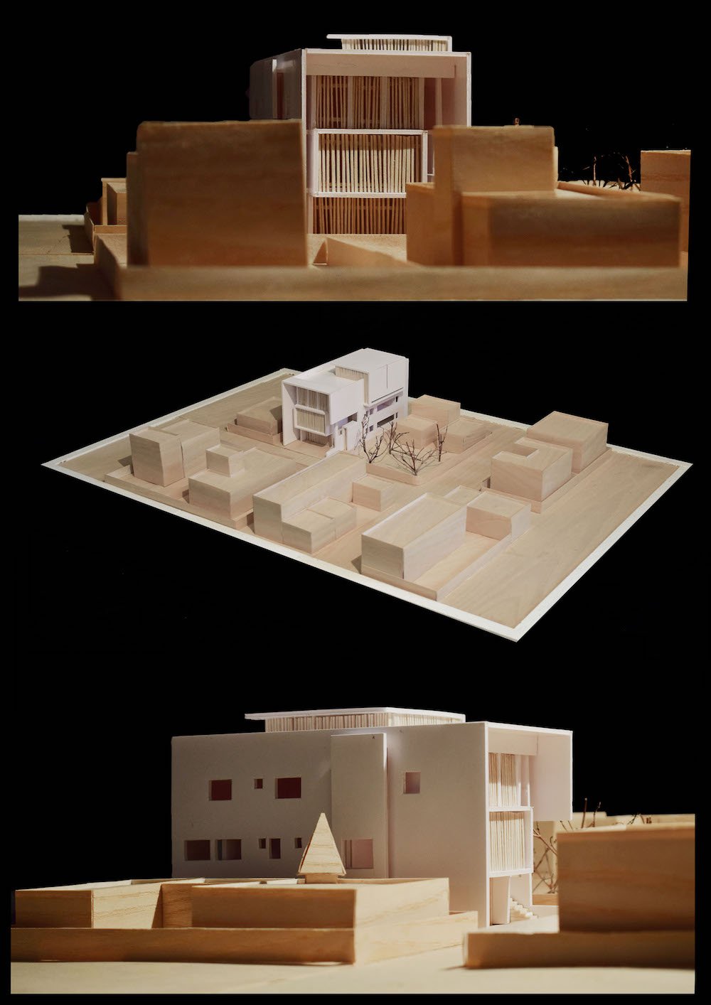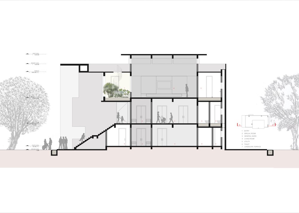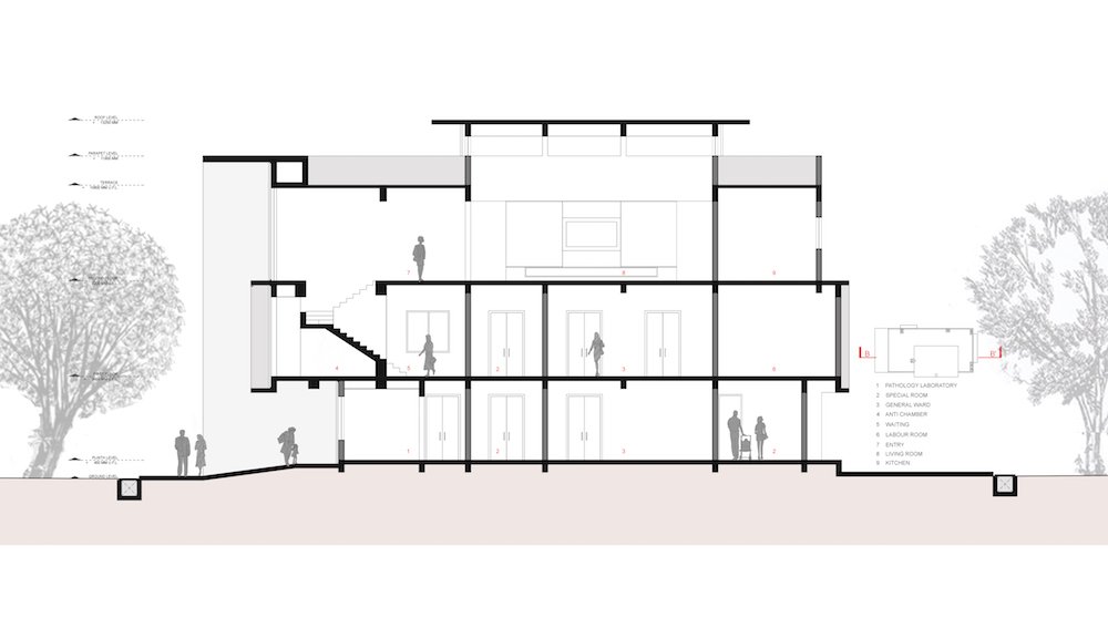 All foundations of the buildings were carefully positioned to preserve the existing elements for their reuse, so that they would became generators of the specific organizations and vistas. Speaking about the structure, Grandeur of the entrance is announced by the upright volume, created by a presence of a slender column and long a cantilevered wall. The ground floor is divided into two halves by a staggered passageway, connecting front and the rear street. This passage expands public realm inside a building connecting a medical, pathology and gym area on the ground floor.