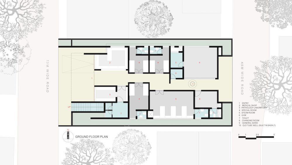 All foundations of the buildings were carefully positioned to preserve the existing elements for their reuse, so that they would became generators of the specific organizations and vistas. Speaking about the structure, Grandeur of the entrance is announced by the upright volume, created by a presence of a slender column and long a cantilevered wall. The ground floor is divided into two halves by a staggered passageway, connecting front and the rear street. This passage expands public realm inside a building connecting a medical, pathology and gym area on the ground floor.