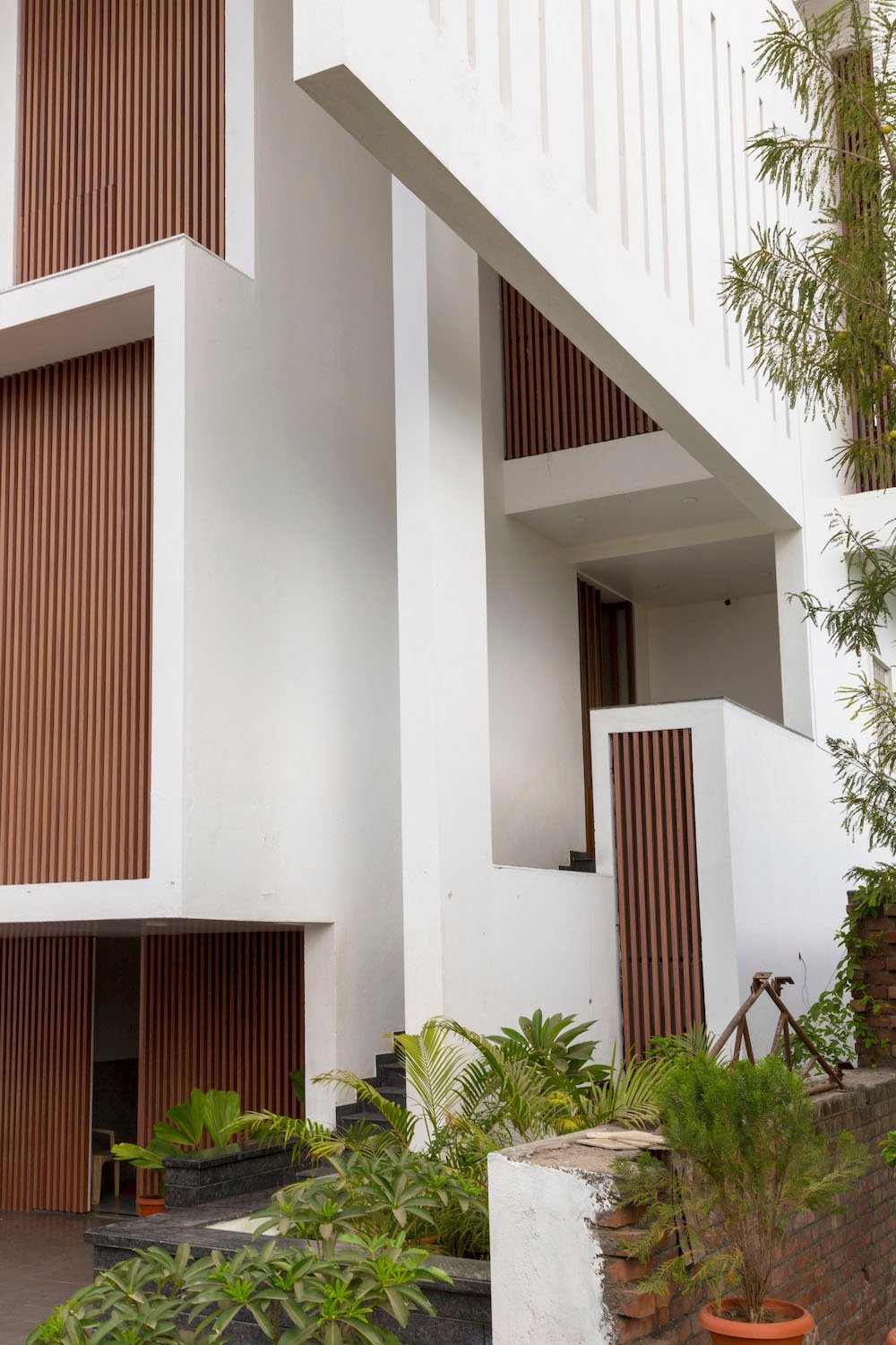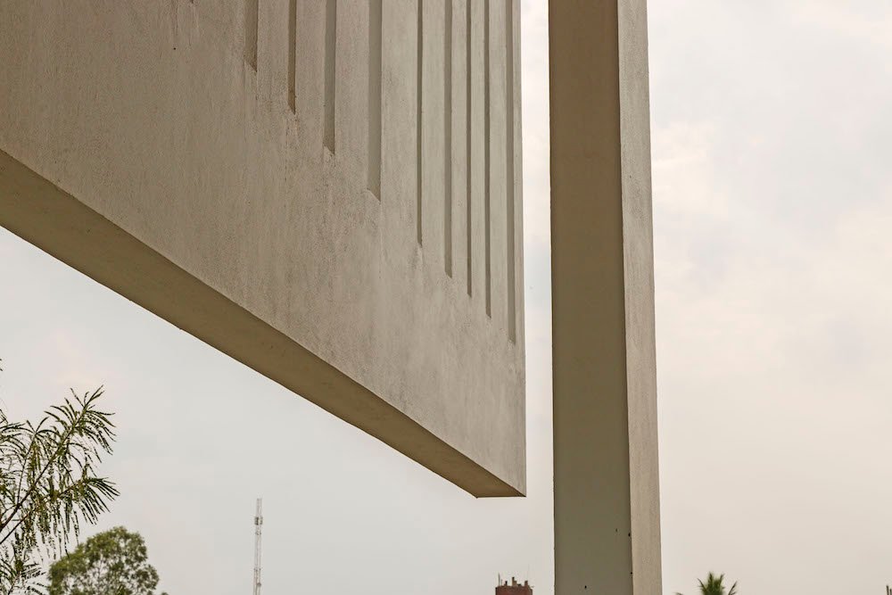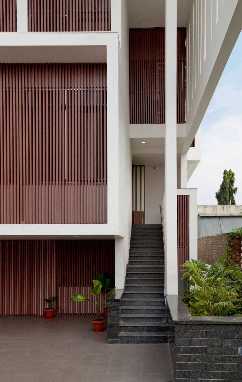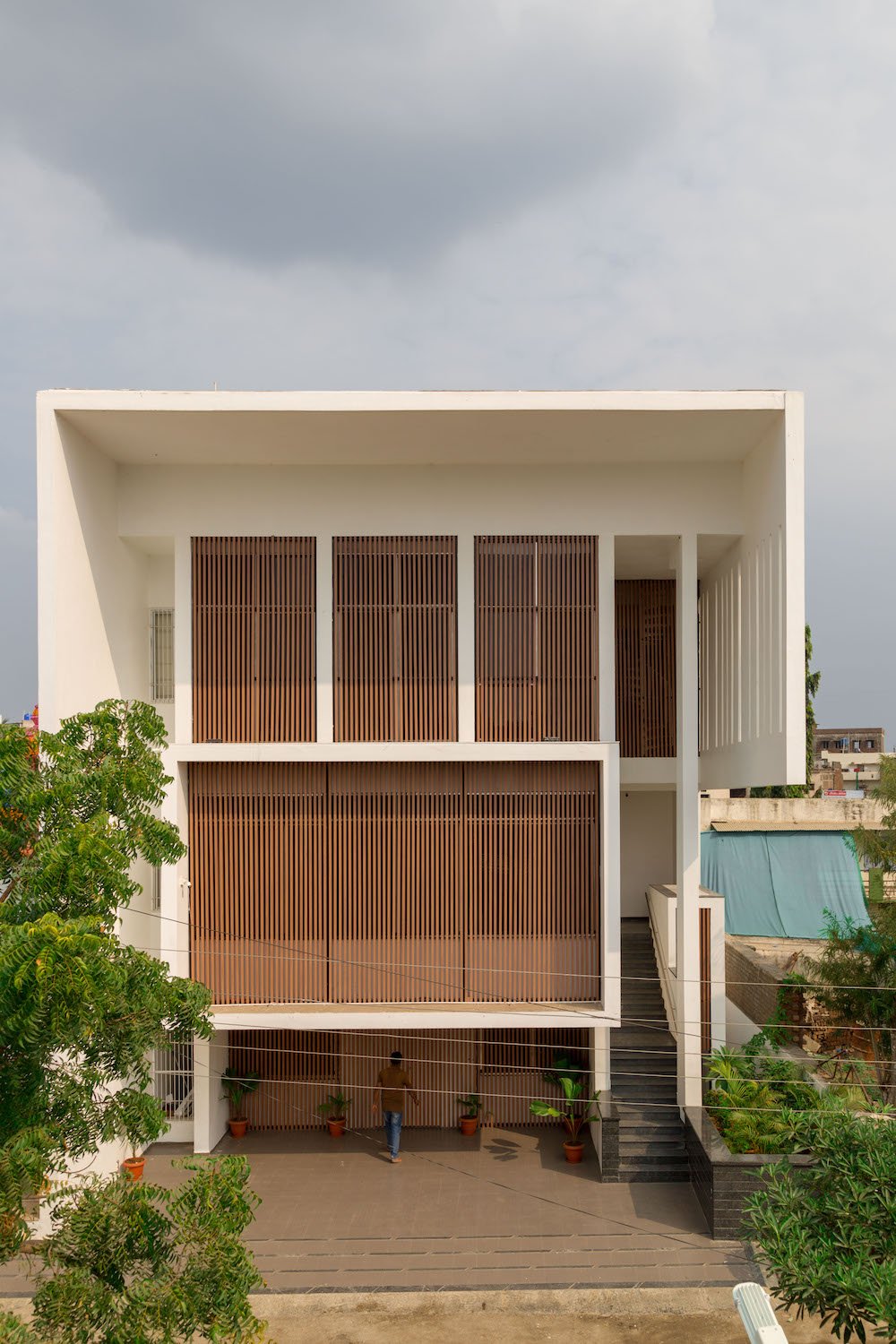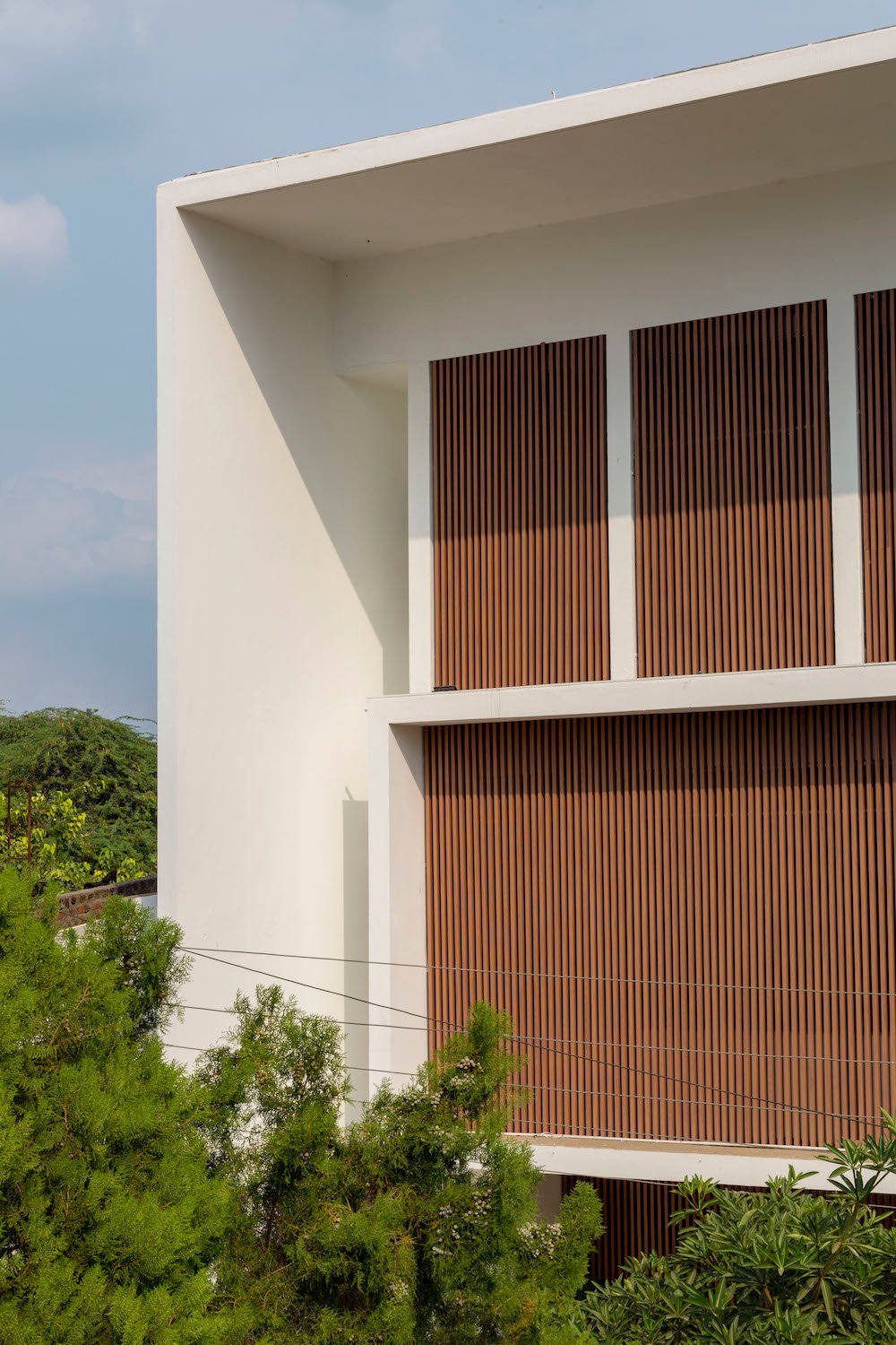 Planning of the building is done in such a way where multiple folds are created on the southern façade to encourage wind flow through gaps between them. The front Façade facing west is articulated to create a gesture like Indian havelis. Graticule windows, projecting lattice boxes and large over hangs reduce surface temperature and regulates wind flow. Significance of this lattice façade is to manifest a dichotomy of motion of privacy and participation simultaneously.