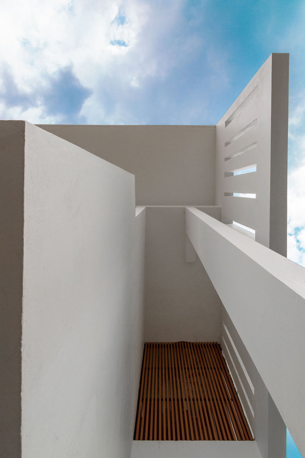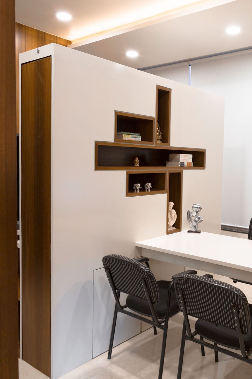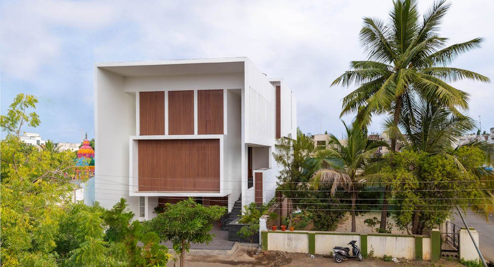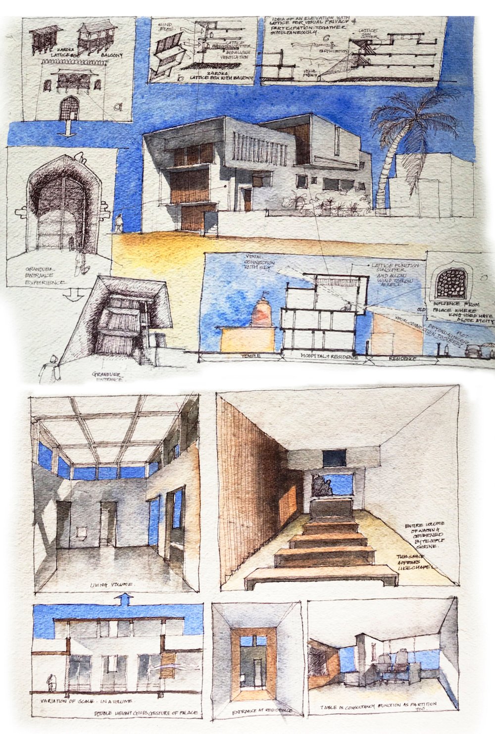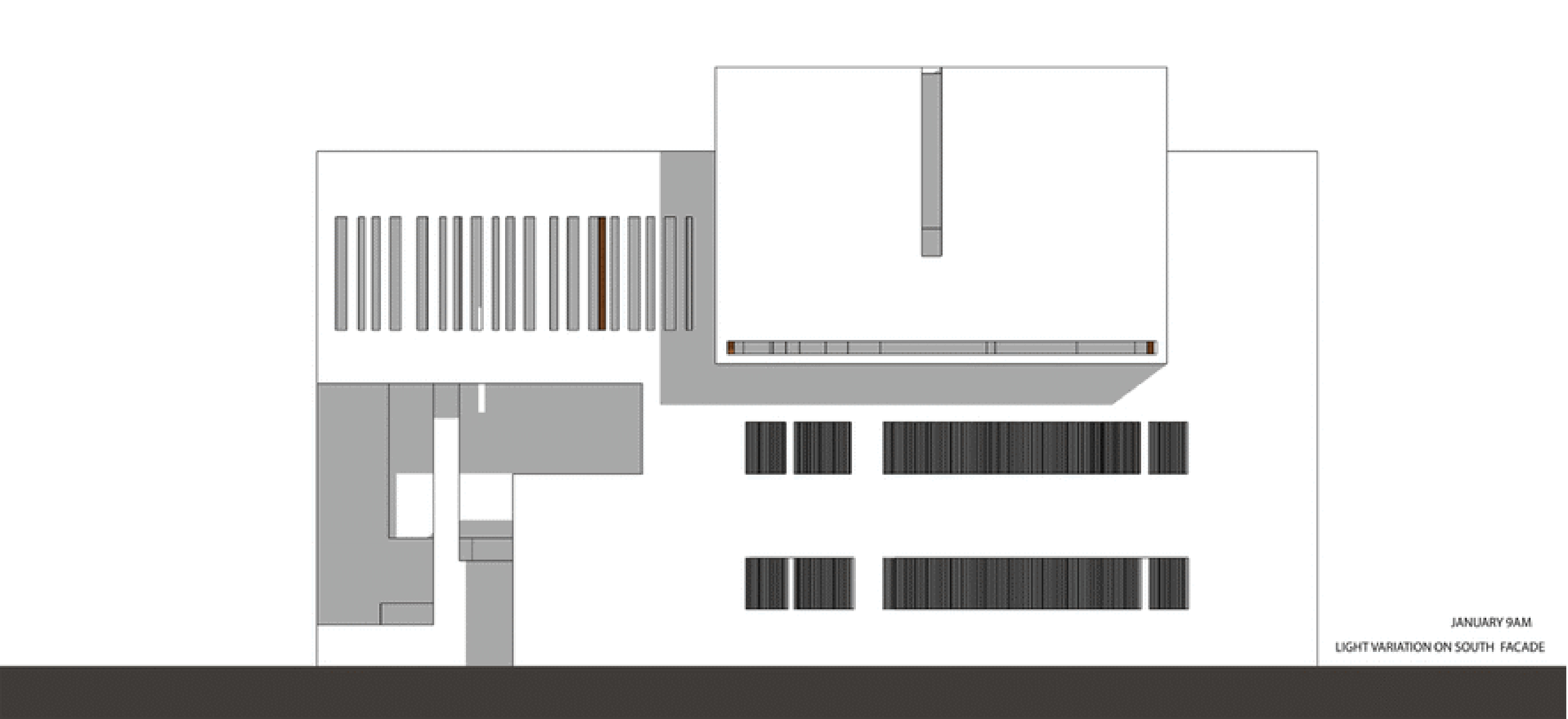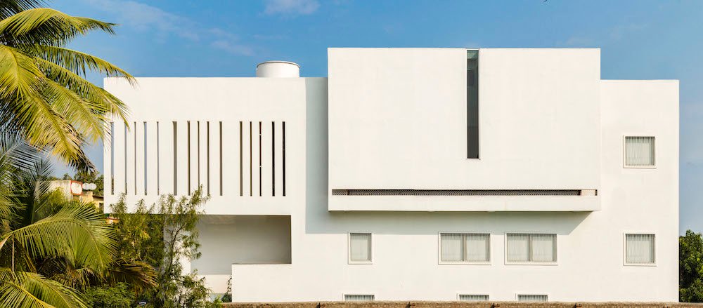 Planning of the building is done in such a way where multiple folds are created on the southern façade to encourage wind flow through gaps between them. The front Façade facing west is articulated to create a gesture like Indian havelis. Graticule windows, projecting lattice boxes and large over hangs reduce surface temperature and regulates wind flow. Significance of this lattice façade is to manifest a dichotomy of motion of privacy and participation simultaneously.